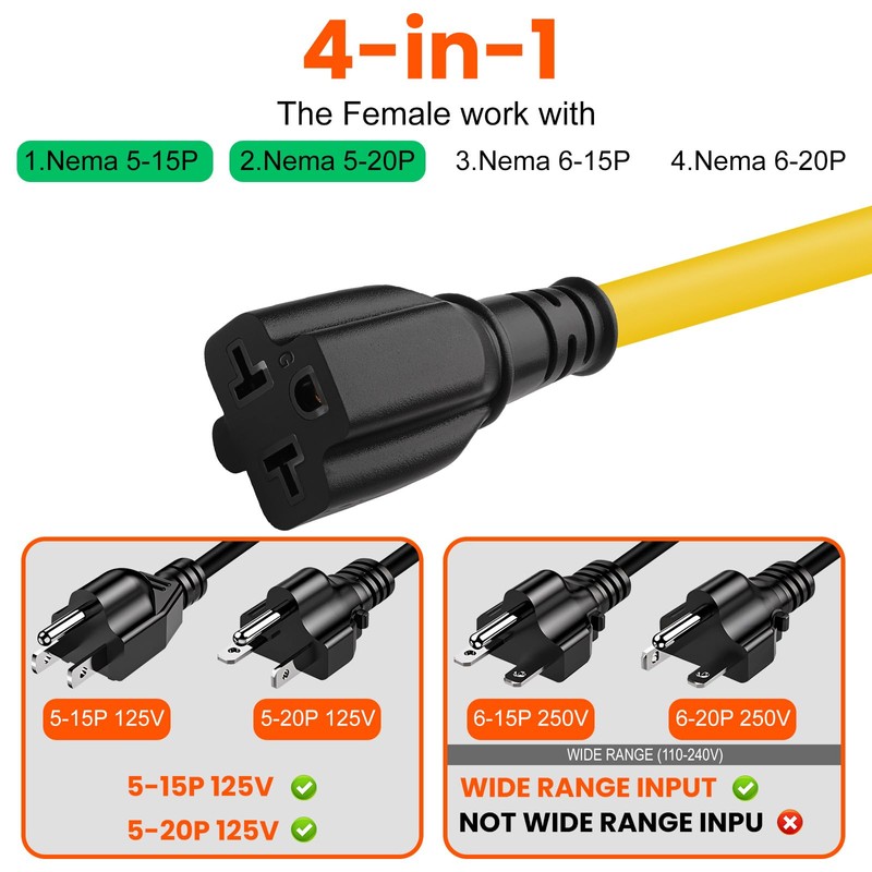 • 【Universal Compatibility】Connect Nema 5-15P 15-AMP Male(125V) to Nema 5-15R 15-AMP Male(125V) Female,Nema 5-20R 20-AMP Male(125V) Female ,Nema 6-15R 15-AMP Male(250V) Female ac adapter,Nema 6-20R 20-AMP Male(250V) Female ac adapter.