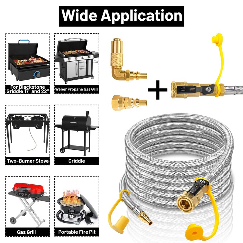 - 【𝐌𝐮𝐬𝐭-𝐇𝐚𝐯𝐞 𝐟𝐨𝐫 𝐑𝐕】--1/4" Quick Connect Burner Hose makes it easy to connect your grill directly to your RV's propane system, eliminating the hassle of lugging around a heavy propane tank. The propane hose is 12ft long so you can position it where you want it.