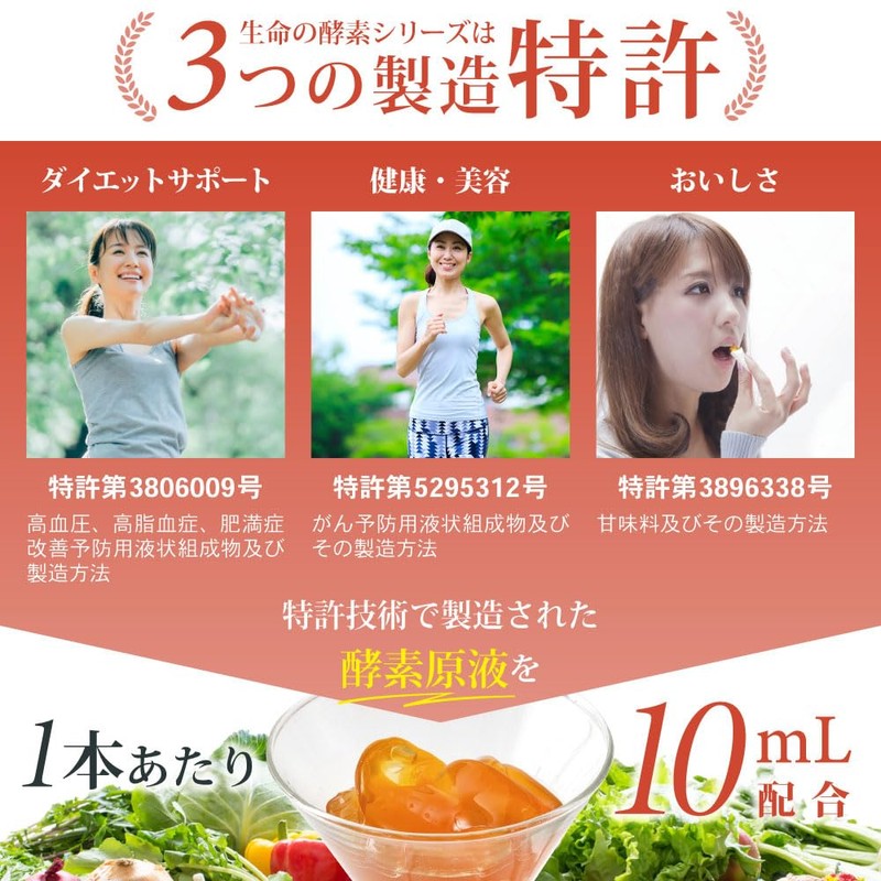 - 生命の酵素は製造特許3つを取得。野菜や果物を自然発酵させた国内産。