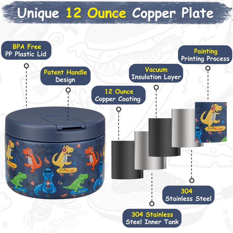 Pawtong 12oz Insulated Vacuum Food Jar with Buckle Lid Wide Mouth Soup Thermo for Hot Food Kids Leakproof Stainless Steel Lunch Container (Blue-Dinosaur)