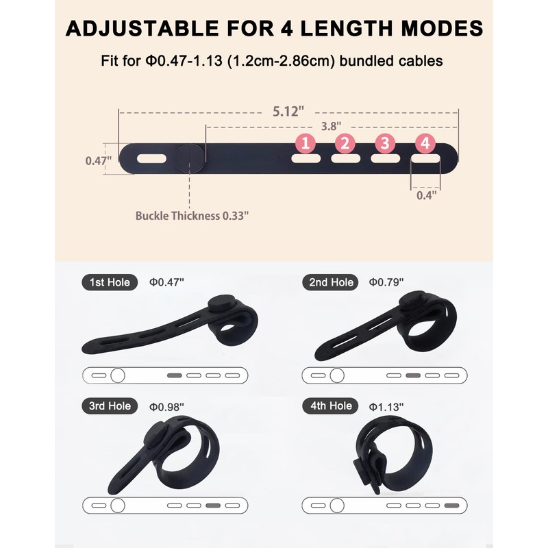 - 🍎【Thoughtful Design】Size: 5.12"(L) X 0.47"(W), Bundled Cables Range: Φ0.47"-Φ1.13". With a locking buckle design, our silicone cable ties make it easier for you to roll the strap to bundle. 4 adjustment holes make it able to fit more sizes of appliance cords and stay put without coming undone. Even when loosened, the cords will not fall off easily.