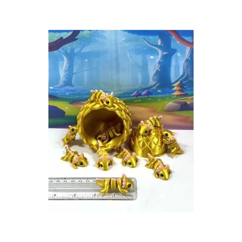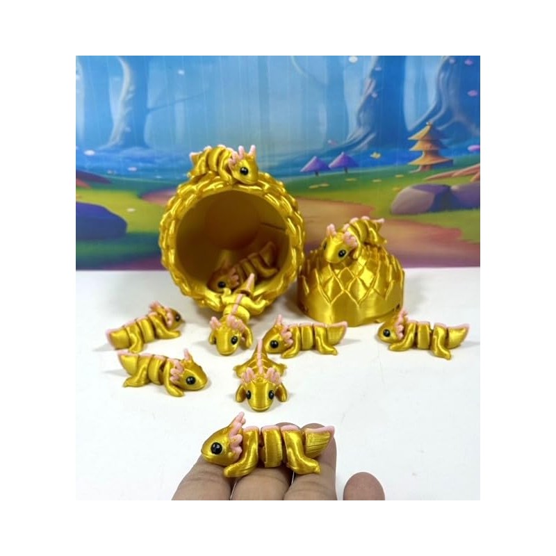 Introducing the MULTI COLOR/ASSORTED COLORS 12 pcs. Mini Axolotl with Egg, Your Articulated 3D-Printed Pal! Each SMALL mini axolotl measures 1.75 inches long ,the crystal egg measures 3 inches tal x 3 inches wide. Meticulously crafted with an eye for detail, this interactive desk accessory is not just a source of entertainment, it's also a stress-relieving toy and a chic decor piece for any space. Get ready for a unique experience with these 4 cuties, they are available for purchase with its very own Egg with Case, offering a perfect spot to conceal tiny treasures or partake in a delightful game of peek-a-boo! ------- Small Components Advisory: ------- Please be mindful that this product may contain small components and may not be suitable for very young children. Due to the nature of 3D printing, there is a potential for small components to detach if handled aggressively or dropped. As such, we advise against allowing younger children to engage with Dinosaurs. Please be aware that 3D printed objects may exhibit minor imperfections like layer lines, inherent to the printing process. While we strive for the highest quality, these imperfections contribute to the distinctive character of each piece, making each raccoon uniquely crafted for you. The available color options are illustrated in the provided photos. Keep in mind that variations in color may arise from discrepancies in filament production and the characteristics of your monitor or screen. Additionally, the use of multi-colored filament rolls can influence color distribution in the prints. ------- Licensing Information: ------- Authorized Design: NOHo3D holds the official authorization for the production of this exquisite design created by Zou3D.