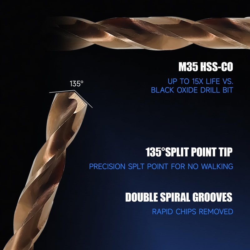 - 【Cutting performance】:M35 cobalt drill bits perform well when cutting harder metals (such as stainless steel, alloy steel, etc.) and can maintain a long service life. The cutting edge is precisely ground, which makes the drill bit cut smoothly and reduces heat generation during the cutting process. With the 135-degree split point tip design, jobber drills can better self-center, reduce sliding, improve the cutting efficiency , and reduce the risk of wear and breakage.