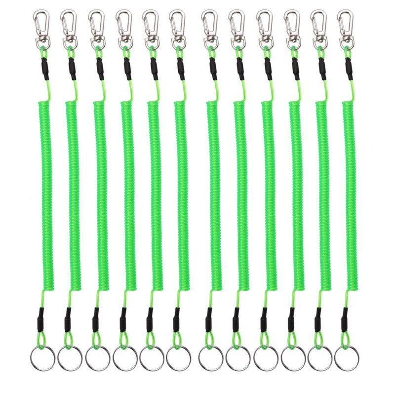 12PCS Fishing Lanyard Spiral Keyring Heavy Duty Retractable Coiled Tether with Carabiner and Split Ring for Pliers, Boating, Tools, Green
