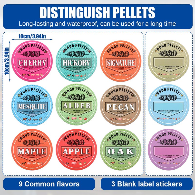 - Package Content: You will receive 12 pieces of wood pellet storage labels, including 9 common BBQ pellet flavors and 3 blank label stickers.