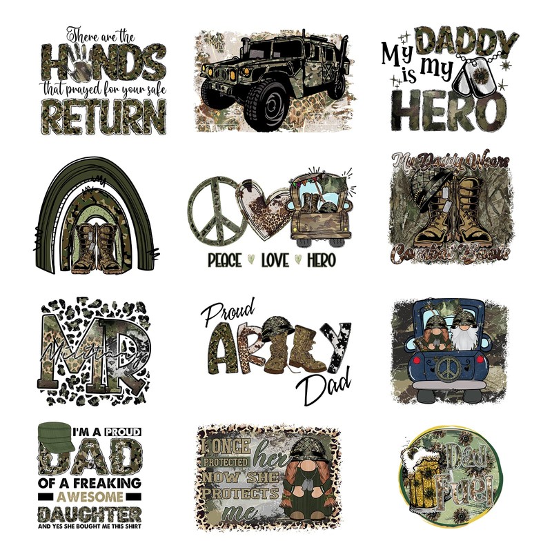 12Pcs Hero Army Dad Iron On Decals for Clothing Father's Day Iron On Patches DIY Heat Transfer Stickers for T-Shirt Jean Appliques