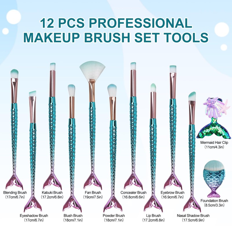 12PCS Makeup Brushes Set with Mermaid Beauty Hair Clip, Women Cosmetic Brushes Set Foundation Powder Cream Eyebrow Eyeliner Blush Cosmetic Concealer Brush Kids Girls Christmas Makeup Tool set Gifts