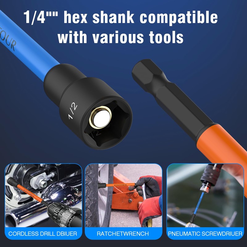 - Multi-Tool Compatibility: Nut driver set magnetic with a universal 1/4-inch hex base, this nut drivers set works seamlessly with wrenches, electric/pneumatic drills, and screwdrivers. The 6-inch length and chamfered edges with strong magnetism allow quick bolt insertion and secure bit retention—ideal for automotive, mechanical, or home repairs in confined spaces