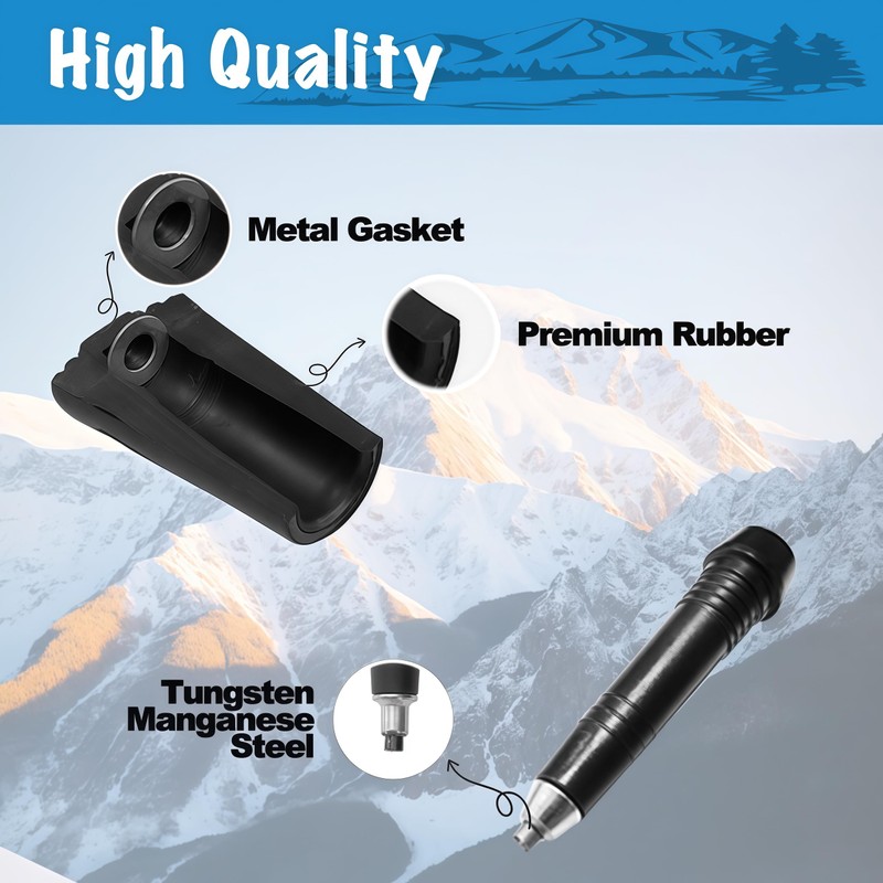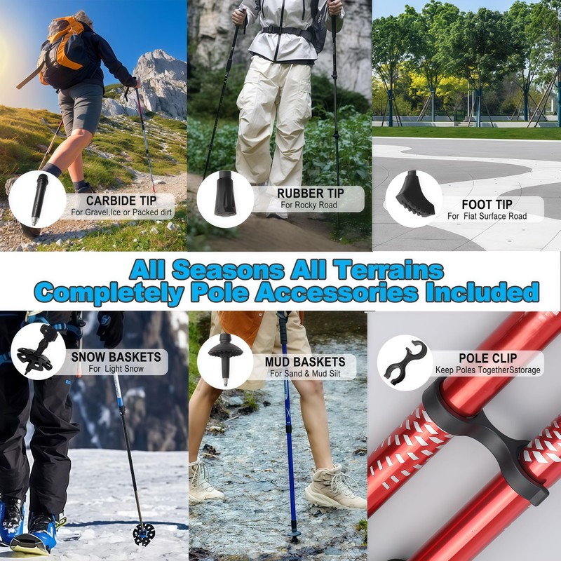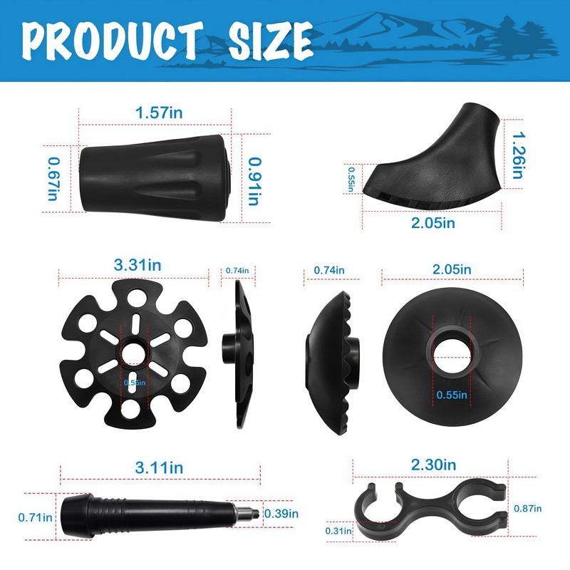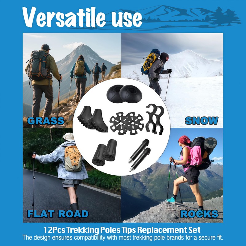 - 12-Piece Set:The trekking pole accessories set includes:Two walking rubber cane tips,two large shock-absorbing foot,two mud baskets, two trekking pole snow baskets,two trekking poles universal carbide tips and two hiking pole clips.This trekking pole accessory set adapts to various mountain terrains, making your perfect companion for hiking, snow climbing, and camping. Its portable design ensures it's always ready to assist your outdoor adventures