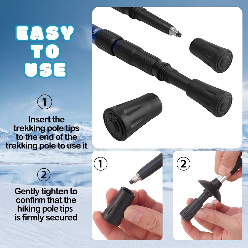 - Function:The rubber cane tips protection for hiking poles to prevent wear and aging. And they are designed to fit most hiking poles and trekking poles, effectively extending the lifespan of your gear. Hiking pole tips across all terrains (paved/sandy/snowy/muddy/rocky) to prevent slippage and boost stability