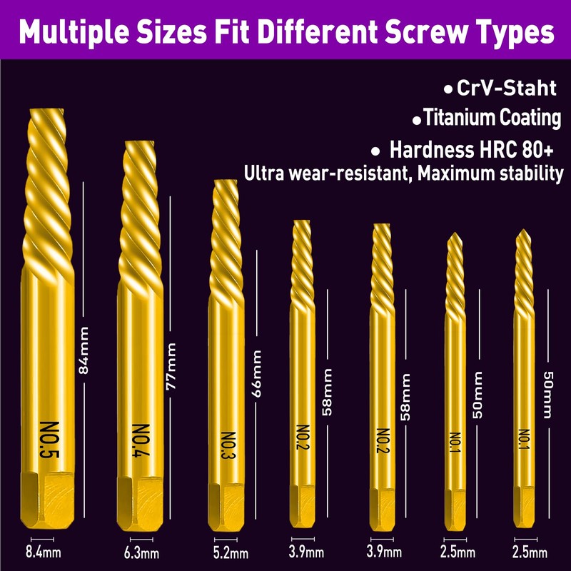 - 【5 Sizes Complete Set】7-piece titanium coated screw extractor set covers M3 to M18. Perfect for removing stripped screws in appliance repair, automotive maintenance and industrial applications. Features HRC 80+ hardness and 50% higher torsional strength than standard tools.