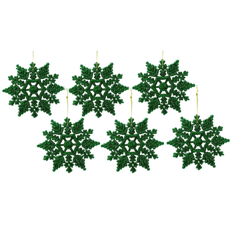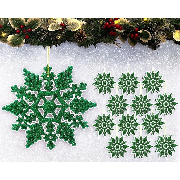 12pk Glitter Snowflake Hanging Decorations, Christmas Tree Snowflake Baubles/Ornaments (Dk Green)