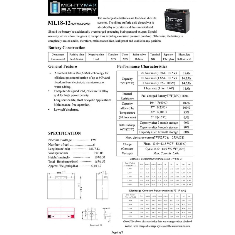 - ML18-12 SLA is a 12V 18AH Sealed Lead Acid (SLA) rechargeable maintenance free battery - UL Certified