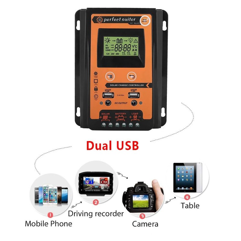 Specifications: Current: 30A, 50A, 70A (optional) Rated Voltage: 12/24V USB Output: 2.4A *2 Over Charge Current(V): 13.7V/*2 24V Over Discharge Current(V): 10.5-11V/*2 24V Temperature Compensation: -3mv/℃/cell Empty Load Wastage: <45mA Loop Voltage Drop: <200mv Display: LCD Display Charging Type: MPPT Waterproof Grade: IP32 Material: Plastic Color: Black + Orange Size: 17.5 * 14 * 4cm/6.9 * 5.5 * 1.6in(30A), 21 * 19.2 * 5.5cm/8.3 * 7.6 * 2.2in(50A), 22.8 * 20 * 5.5cm/9 * 7.9 * 2.2in(70A) Package Weight: 480g-1284g Package List: 1 * Solar Charge Controller 1 * User Manual Notes: 1\. The function of controller is to protect voltage overshoot and overplay. 2\. When the battery voltage is too low, the controller stops the output; after the solar panel is charged, the cell recovers to 12.6V. 3\. 12.6V is the recovery discharge voltage. 4\. The normal voltage of the controller is 10.7V to 13.7V. These two voltage fluctuations can be set manually. If you have trouble in use, try adjusting the float voltage to 13.7V: First, you need to press the MCU control button for about 3-4 seconds, and then there will be a management interface on the screen. Second, you must press the add button on the screen until the voltage reaches 13.7V. Finally, you need to press the MCU control button again, which will save the controller record data when the display does not flicker.