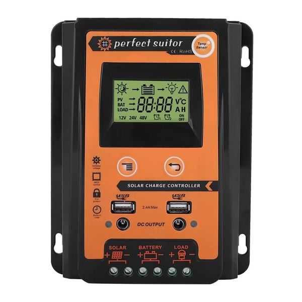 Specifications: Current: 30A, 50A, 70A (optional) Rated Voltage: 12/24V USB Output: 2.4A *2 Over Charge Current(V): 13.7V/*2 24V Over Discharge Current(V): 10.5-11V/*2 24V Temperature Compensation: -3mv/℃/cell Empty Load Wastage: <45mA Loop Voltage Drop: <200mv Display: LCD Display Charging Type: MPPT Waterproof Grade: IP32 Material: Plastic Color: Black + Orange Size: 17.5 * 14 * 4cm/6.9 * 5.5 * 1.6in(30A), 21 * 19.2 * 5.5cm/8.3 * 7.6 * 2.2in(50A), 22.8 * 20 * 5.5cm/9 * 7.9 * 2.2in(70A) Package Weight: 480g-1284g Package List: 1 * Solar Charge Controller 1 * User Manual Notes: 1\. The function of controller is to protect voltage overshoot and overplay. 2\. When the battery voltage is too low, the controller stops the output; after the solar panel is charged, the cell recovers to 12.6V. 3\. 12.6V is the recovery discharge voltage. 4\. The normal voltage of the controller is 10.7V to 13.7V. These two voltage fluctuations can be set manually. If you have trouble in use, try adjusting the float voltage to 13.7V: First, you need to press the MCU control button for about 3-4 seconds, and then there will be a management interface on the screen. Second, you must press the add button on the screen until the voltage reaches 13.7V. Finally, you need to press the MCU control button again, which will save the controller record data when the display does not flicker.