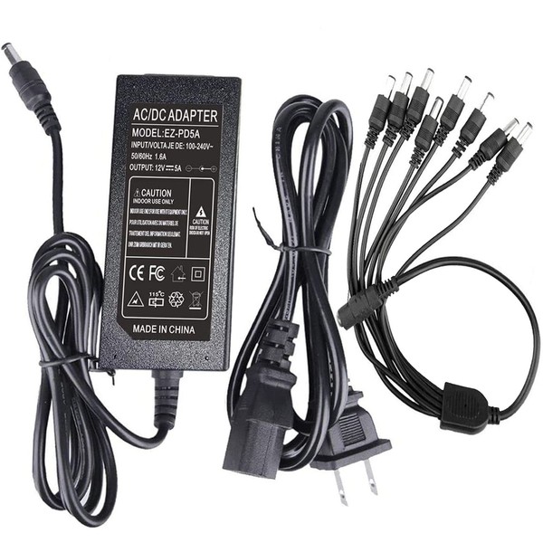 12V 5A Power Adapter Charger LED Strip AC 100V-240V, DC 12 Volt 5 Amp 60 Watt Converter Driver Universal Lighting Transformer for 12 V 5 A with 2.1X5.5mm Plug 1 Female to 8 Male Power Split Cable