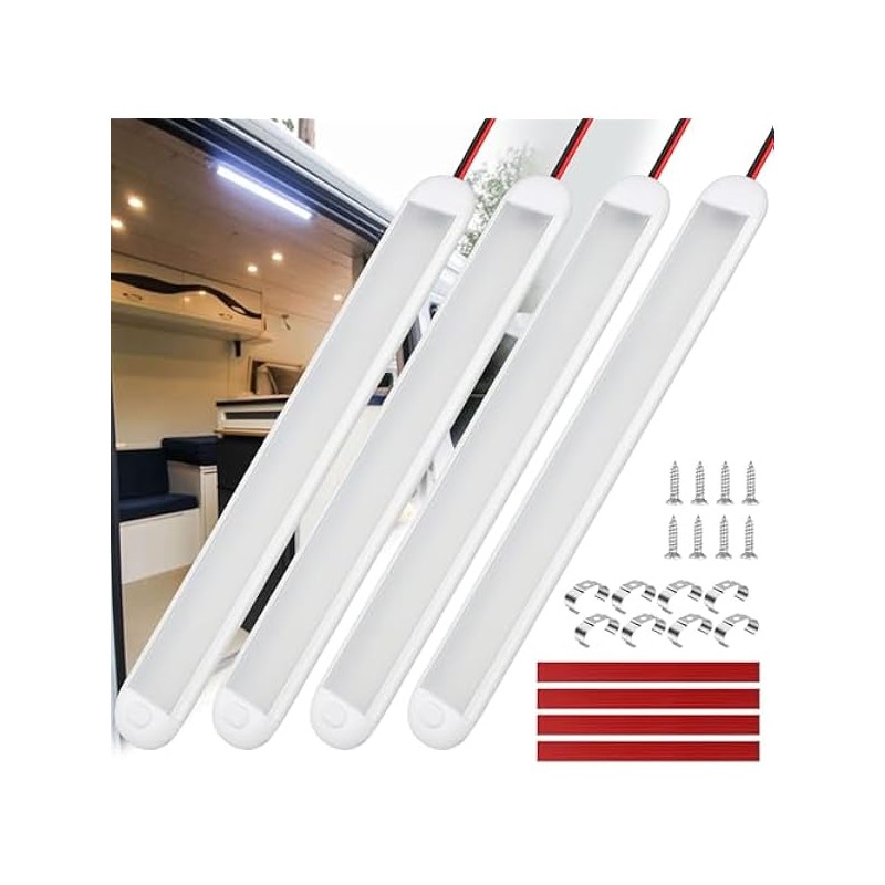 Included Components:12V led light * 4 pcs, 4 pcs * strong self-adhesive tape, 8 pcs * stainless steel screws, 8 pcs * stainless steel clips