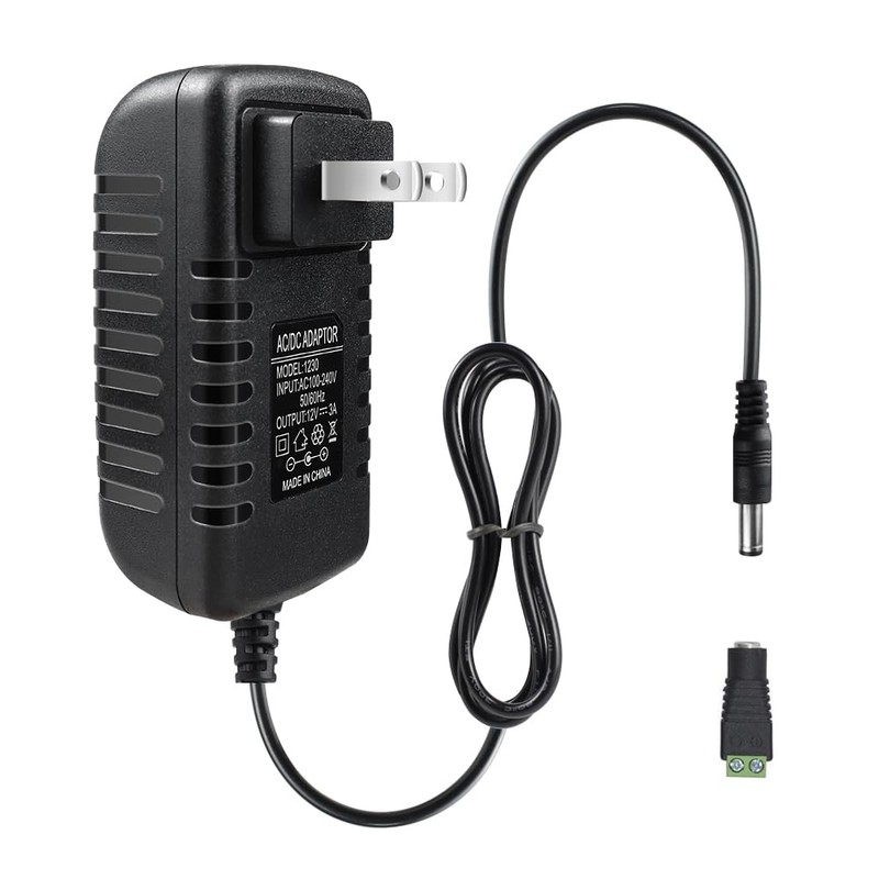 - Package Includes: 1 x 12V 3A 36W power supply with 100cm/3.3 ft long cable; 1 x 5.5/2.1 DC female barrel connector to screw adapter