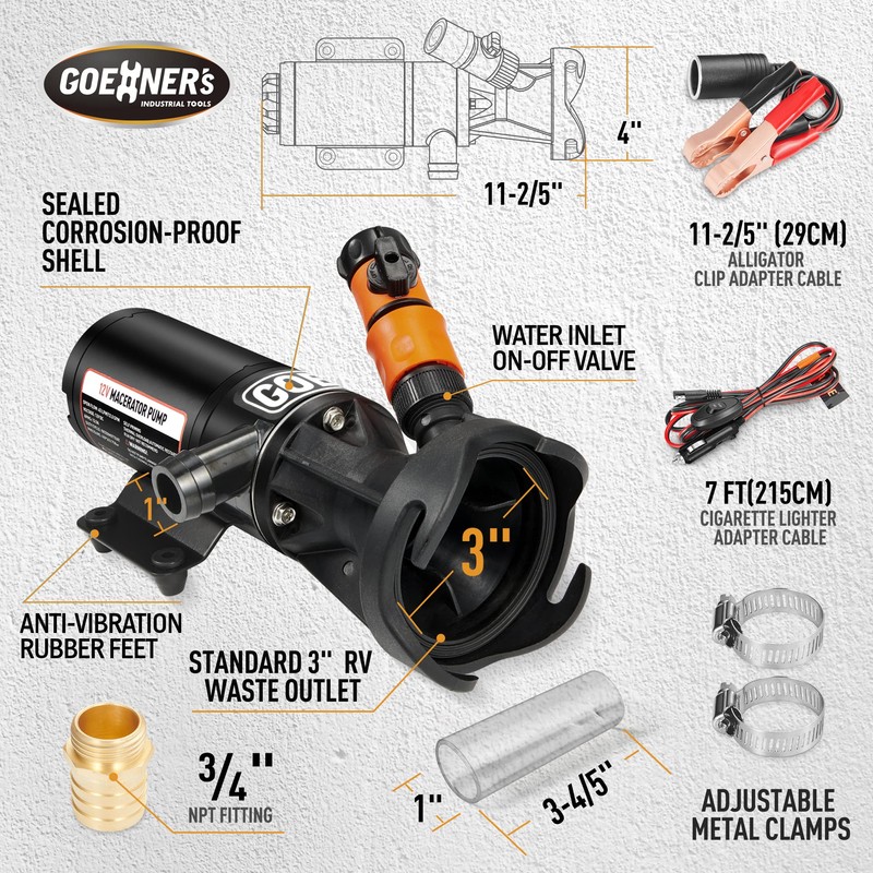 - 【Product Specification】Complete RV Macerator Pump Kit, don't need to buy any accessories, connects to standard 3" RV waste outlet. Water Inlet: 3 inch, Water Outlet: 1 inch, Voltage: 12V DC , Flow Capacity: 12 GPM, Self-priming Suction: 3.2 feet, Lift: 10 feet, Current: 12A.