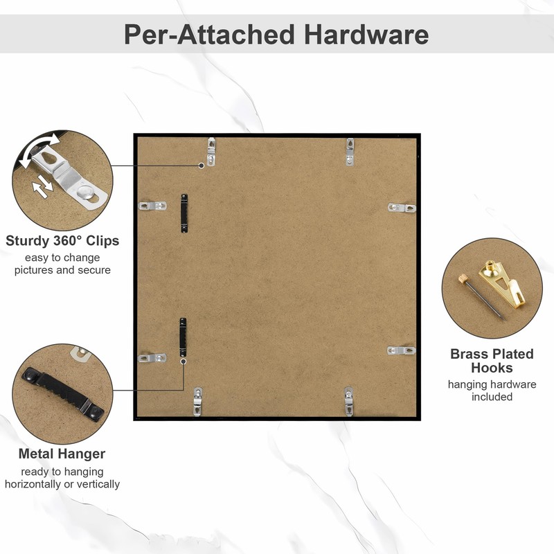 - Display Effect: The 12x12 black aluminum picture frame is perfect for showcasing your photos. It accommodates 8x8-inch pictures with a mat or 12x12-inch pictures without a mat. Known for its lightweight construction, the aluminum frame is easy to handle and mount, requiring no heavy-duty hardware. It can be displayed both horizontally and vertically, offering versatile options to suit your space