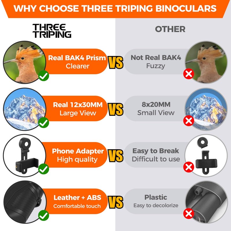 • 12X30 POWERFUL HD BINOCULARS : With 12x magnification and 30mm large objective lens, Three Triping small binoculars for adults and kids deliver 367ft/1000yds large field of view with clear and bright images, letting you look father and see wider. With BAK4 prism and FMC lenses, this kids binoculars allow for more light transmission than others, you can easily identify objects even in low light conditions.
