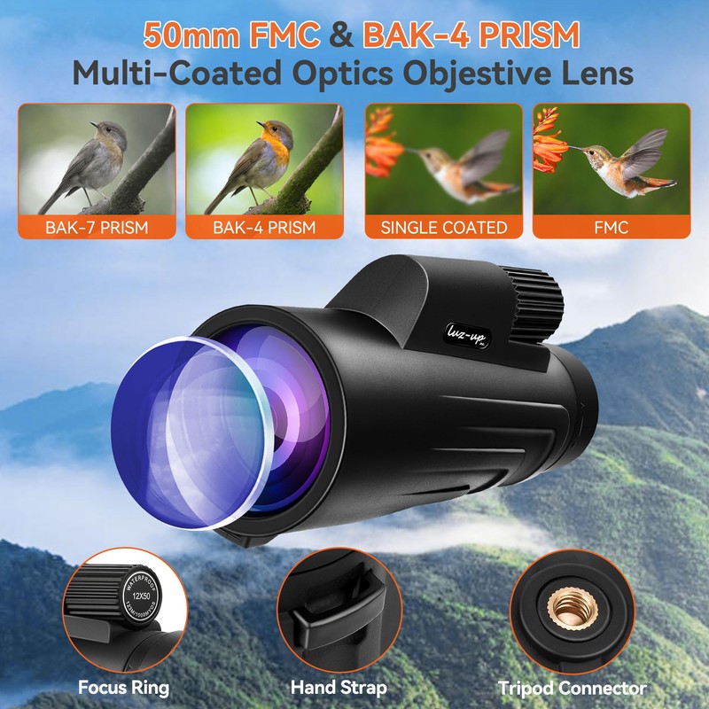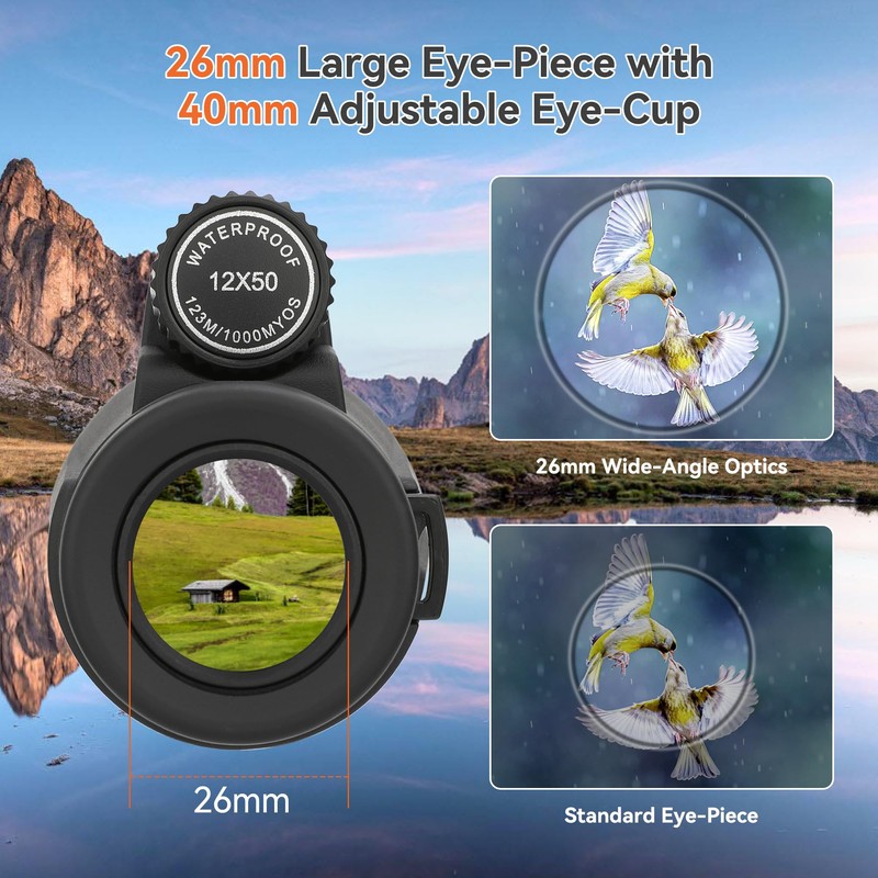 - 【HD High Power Monocular Telescope】 50mm FMC & BAK-4 PRISM Multi-Coated Optics Objective Lens & 26mm Large Eye-Piece with 40mm Adjustable Eye-Cup, that's make you faster and easier to get focus and the 26mm eye-piece make the perspective broader and more comfortable. Fully multi coated lenses to improve the light transmission rate and resolution, so that your field of vision is brighter, the image is clearer and sharp, Ideal for outdoor enthusiasts and wilderness explorers.