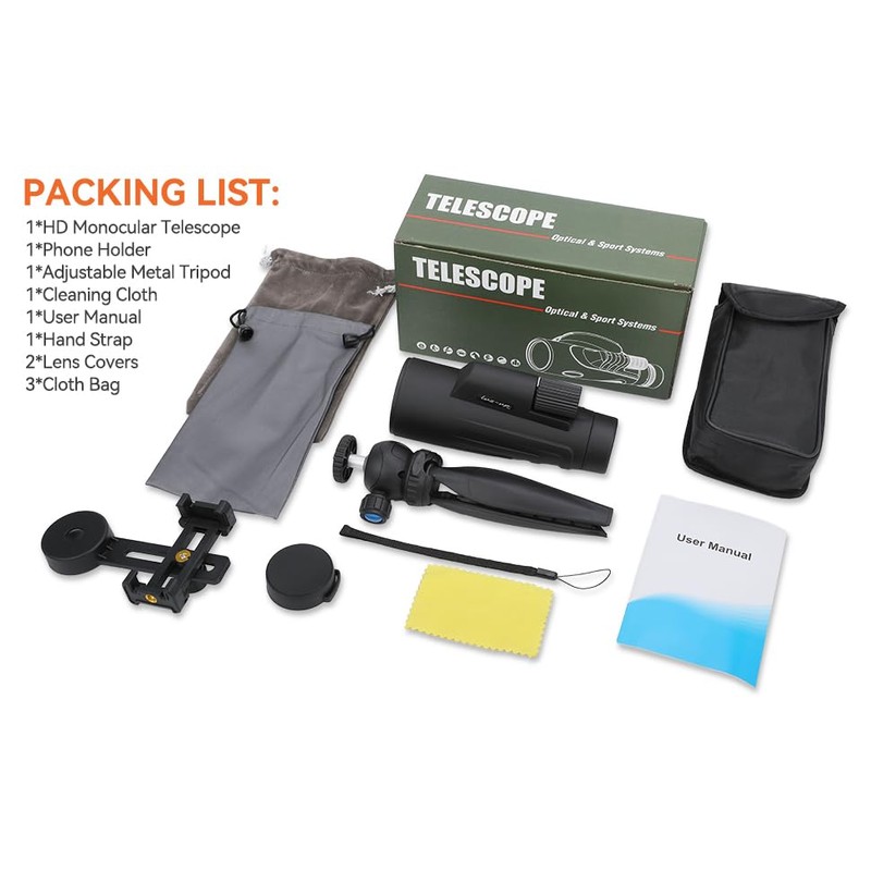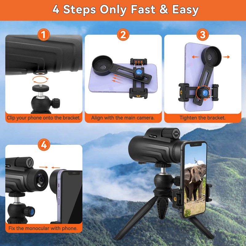 - 【High stability smartphone adapter and tripod】Monocular telescope for smartphone equipped with upgradation smartphone adapter, more easy and faster to installation on your phone. Upgraded sturdy tripod with high stability, allowing you to achieve clear and shake-free images.