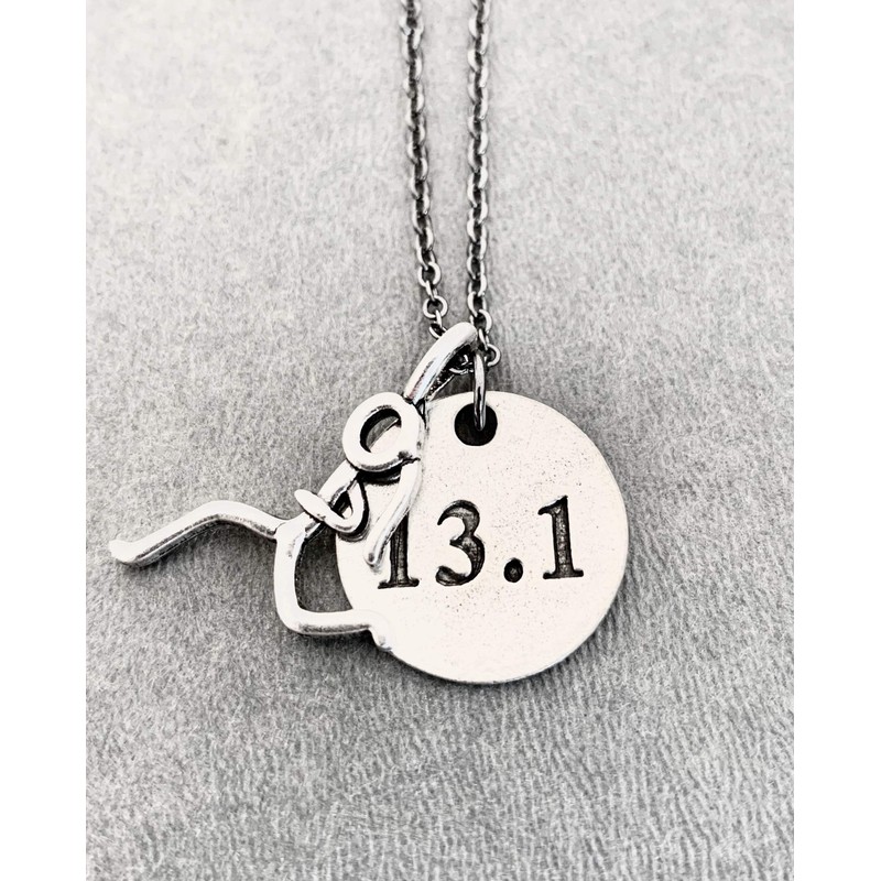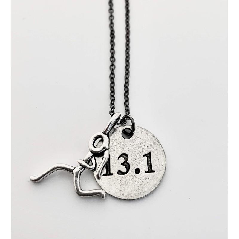 13.1 RUNNING GIRL Pewter Necklace - Pewter Running Girl Stick Figure Charm and Pewter Round 13.1 Pendant on 18 inch Gunmetal Chain