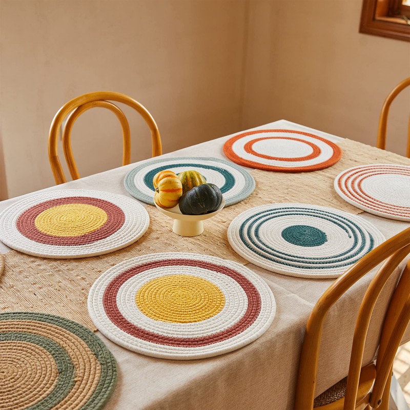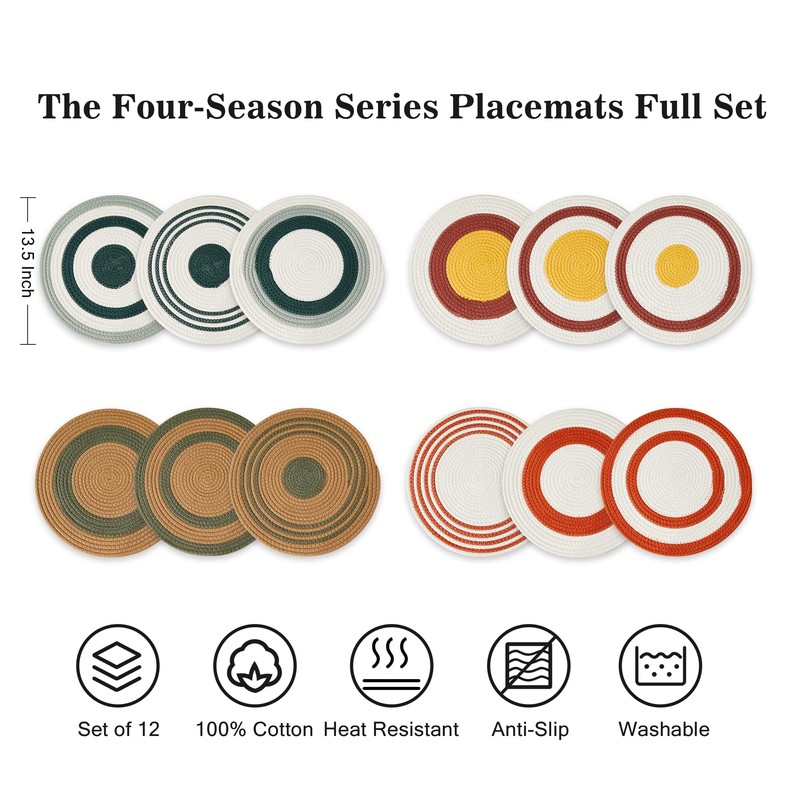 13.5" Round Woven Placemats Set of 12 Large - Cotton Rope Boho Place Mats Table Mats Set - Thick Heat Resistant Kitchen Trivet Hot Pads Pot Holder for Dining Table(Four-Season Series Full Set)