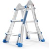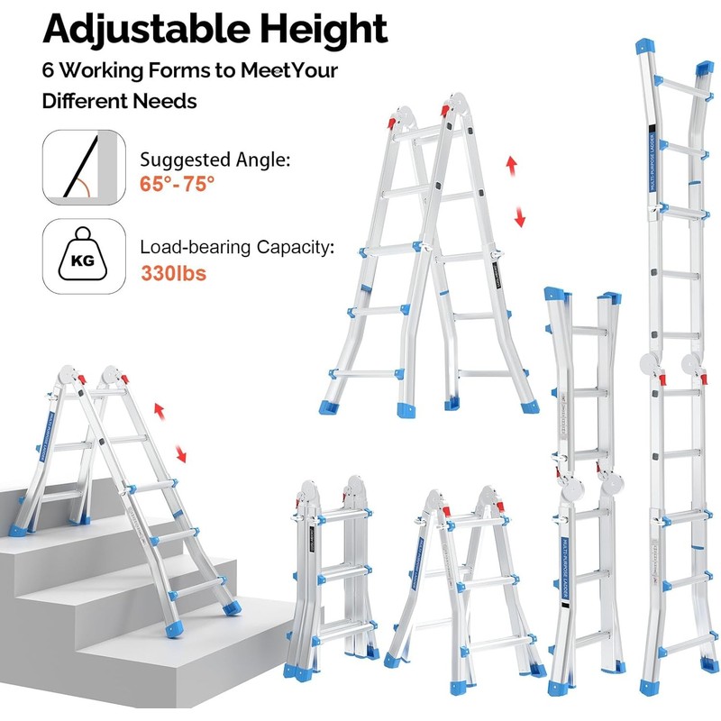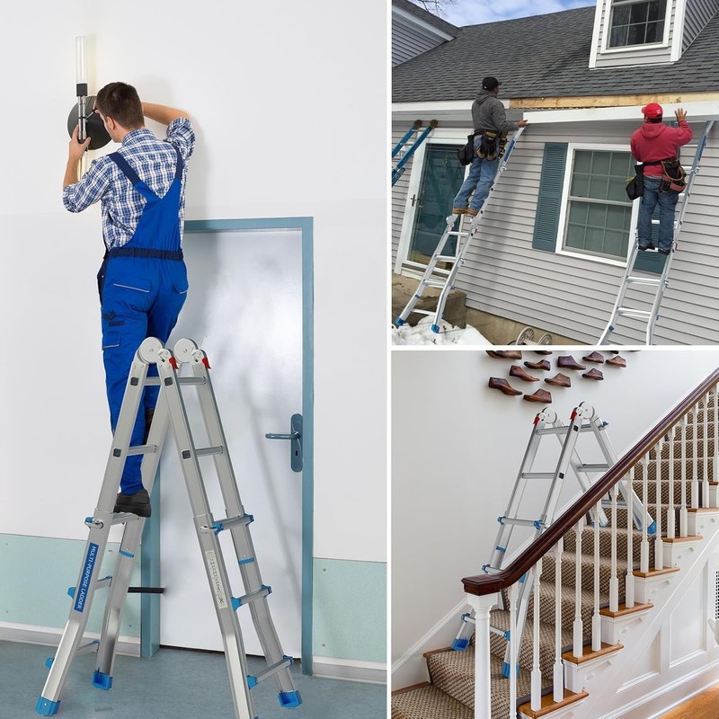 The Multifunctional collapsible ladder can convert to an A-frame ladder, extension ladder, trestle-and-plank, 90-degree, and staircase with ease. Can be used for cleaning, repairs, painting indoors, trimming trees, picking fruit, cleaning gutters, etc.