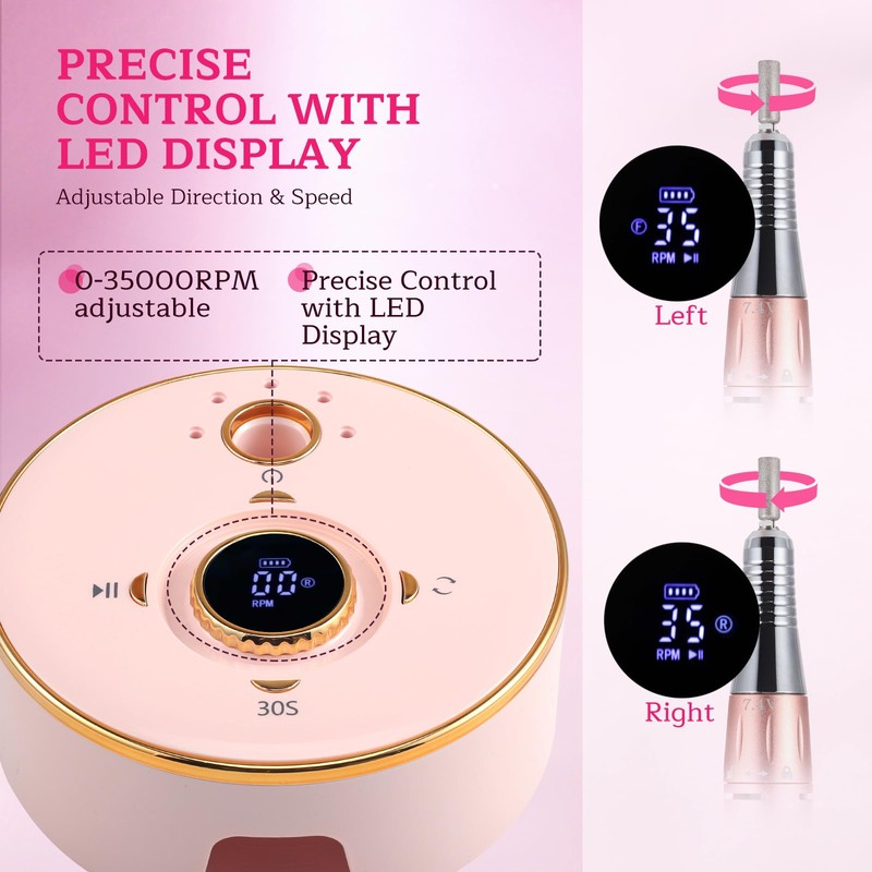 - 【Verstellbare Rückwärtsrichtung und Flexibilität】Mit Zwei-Wege-Rotation und einem klaren HD-LED-Display zeigt der Nagelschneider Batteriekapazität, Geschwindigkeit und Richtung an. Perfekt für Linkshänder, Nagelmeister und Anfänger. Geringe Vibrationen, niedriger Geräuschpegel und stabile Leistung sorgen für angenehmen Komfort.