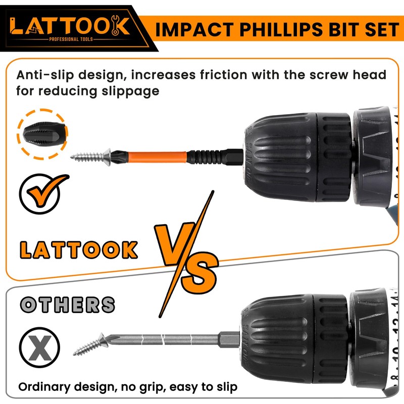 - DURABLE MATERIALS: LATTOOK adopts high-quality S2 alloy steel material with our special heat-treatment technology ,which offers exceptional wear resistance, impact resistance, and hardness, enhancing the strength of bits.Manganese black phosphate surface to prevent rust even in the rain