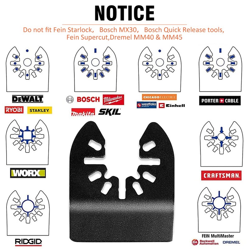 - 🛠Multitool Blades Universal: These oscillating saw blades for Fein Multimaster (only for the old version, does not fit on Fein Multimaster FFM 350), Fein RT-MG108L, RT-MG200E / 2F Makita, TM3000C, DTM50Z, TM3010CK, Aldi Workzone, CEL MTP1, 144MT 14.4V, Challenge Extreme, Draper Worx WX680, SDS Sonicrafter F30, F50, WX678.9 Li-Ion, WX667.1, WX679 250w, Multi Talent FMM350Q FMT250 FMM250Q, Hitachi CV18DBL / W4 18V builder ERB474HTL, ERB620HTL 220, ERI616H -TK 108li