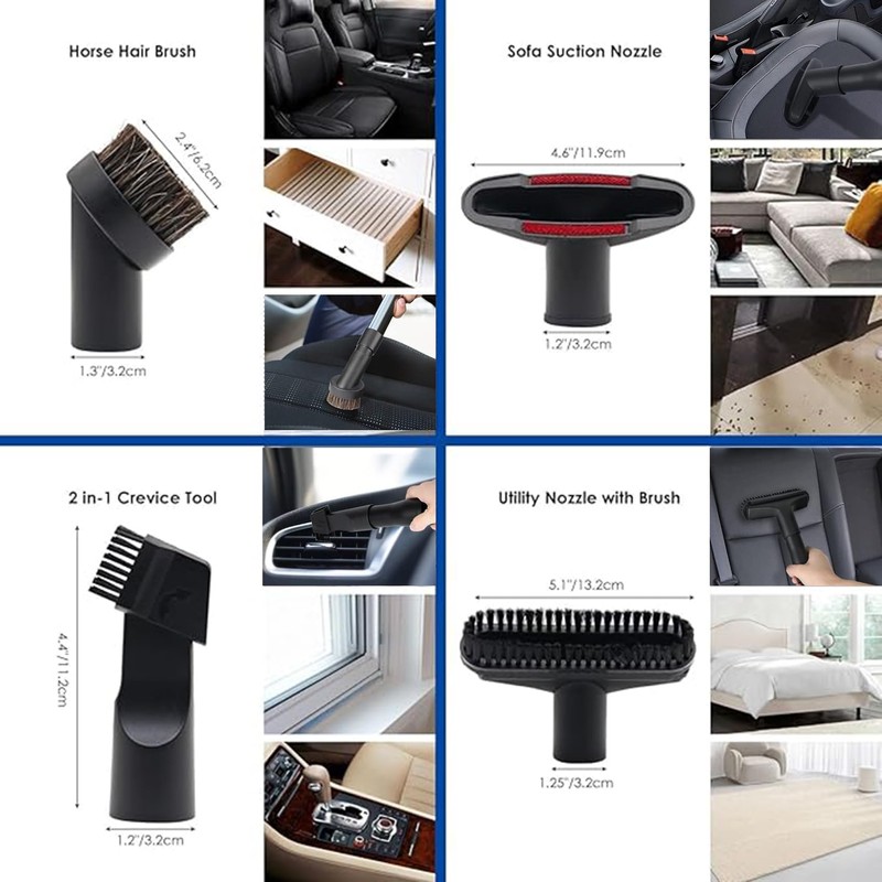 - 【Value Pack of 13】 Package includes 2xExtension tube, 1xHorsehair round brush, 1xTwo-in-one flat suction, 1xSofa suction nozzle, 1xT-shaped brush, 1xlong soft flat suction nozzle, 1xFlat suction nozzle, and 5×vacuum adapters