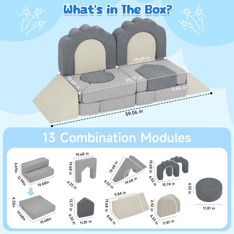 Discover the ultimate play companion for your little ones with our 13-piece toddler soft climbing toy set. This versatile indoor climber seamlessly doubles as a cozy toddler sofa, making it an essential addition to any playroom, bedroom, or living room. Each set features charming flower-shaped cushion toys, adding a touch of whimsy to playtime adventures.