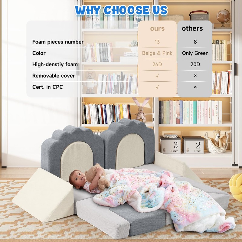 - Multifunctional Fun Combo: Comes with a 13-piece set, featuring charming flower-shaped cushions. These soft climbing blocks can be transformed into forts, castles, tunnels, or a cozy reading nook, offering both comfort and adventure. Ideal for active play, it encourages crawling, climbing, and imaginative exploration, making it a must-have addition to any playroom