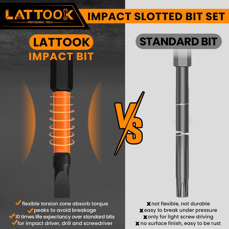 - IMPACT RATED BITS: Torsion zone to absorb torque peaks to avoid breakage, taking pressure off of the drill tips for increased durability in high torque applications which will not twist and break easily, it can be handle a new generation of higher torque impact drivers, 10 times life expectancy versus standard bits. For impact driver, drill and screwdriver. Strengthened magnetic impact slotted bits helps you easy pick up screws. The magnetism doesn’t decay after multiple uses