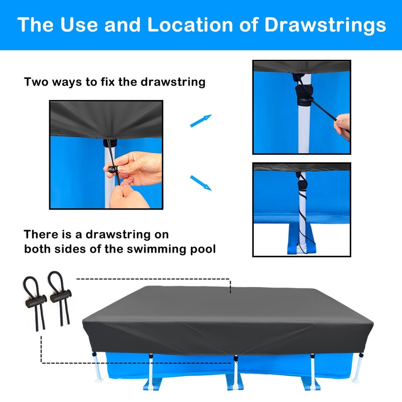 - 【Great Materials】Our rectangular frame pool cover is made of 210D high-strength oxford fabric which has been added with a drawcord design, there are 12 pull tabs sewing on the cover, and have 12 Velcro straps to help you enhance the stability of the rectangular frame pool cover. We have enhanced our pool cover with additional material and increased its depth from 7.8 inches to 11.81 inches. This two significant upgrade provides greater coverage for your pool, ensuring superior protection.