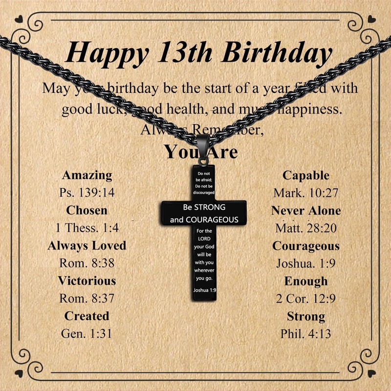 13 Years Old Birthday Gifts for Men, Black Cross Necklace 13th Birthday Decorations Religious Christian Jewelry Bible Verse Joshua 1:9 for Men, Son, Grandson, Nephew Black