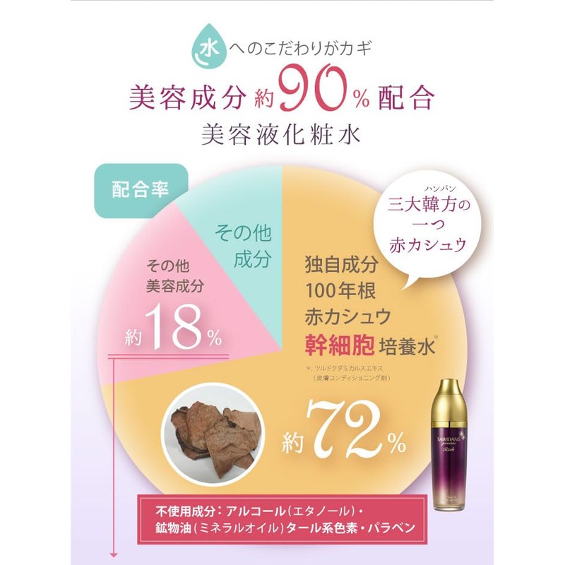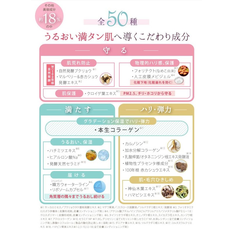 ●成分:ツルドクダミカルスエキス、BG、DPG、水、ペンチレングリコール、グリセリン、ベタイン、1,2-ヘキサンジオール、サッカロミセス/ブクリョウタケ菌核発酵エキス、ツルドクダミ根エキス、マグワ果実/(スクロース発酵液/ツルドクダミ根エキス)発酵液、サッカロミセス/(ハマスゲ根/ホオノキ樹皮/ボタン根/モモ核)発酵エキス液、スイゼンジノリ細胞外多糖体、(アクリル酸ブチル/イソプロピルアクリルアミド/ジメタクリル酸PEG-18)クロスポリマー、フォリオタミクロスポラ多糖体、クロイゲ葉エキス、フェルラ酸、カルノシン、乳酸桿菌/オタネニンジン根エキス発酵液、加水分解コラーゲン、ダミアナ葉エキス、アテロコラーゲン、ハチミツエキス、ヒアルロン酸Na、セラミドNP、タイツリオウギ根エキス、オニノダケ根エキス、スイカズラ花エキス、カンゾウ根エキス、ガラクトミセス培養液、クコ果実エキス、アマドコロ根茎/根エキス、マグワ葉エキス、オニノヤガラ根エキス、オリーブ果実油、スクワラン、シア脂、ハマビシ果実エキス、コルヌスワルテリエキス、アラントイン、アルギニン、グリチルリチン酸2K、β-グルカン、加水分解エンドウタンパク、レシチン、水添レシチン、(エイコサン二酸/テトラデカン二酸)ポリグリセリル-10、PG、フィトステロールズ、コレステロール、乳酸Na、ビオチン、エチルヘキシルグリセリン、ポリソルベート80、カルボマー、クエン酸Na、クエン酸、EDTA-2Na、酢酸トコフェロール、PEG/PPG-17/6コポリマー、プロパンジオール、フェノキシエタノール、香料