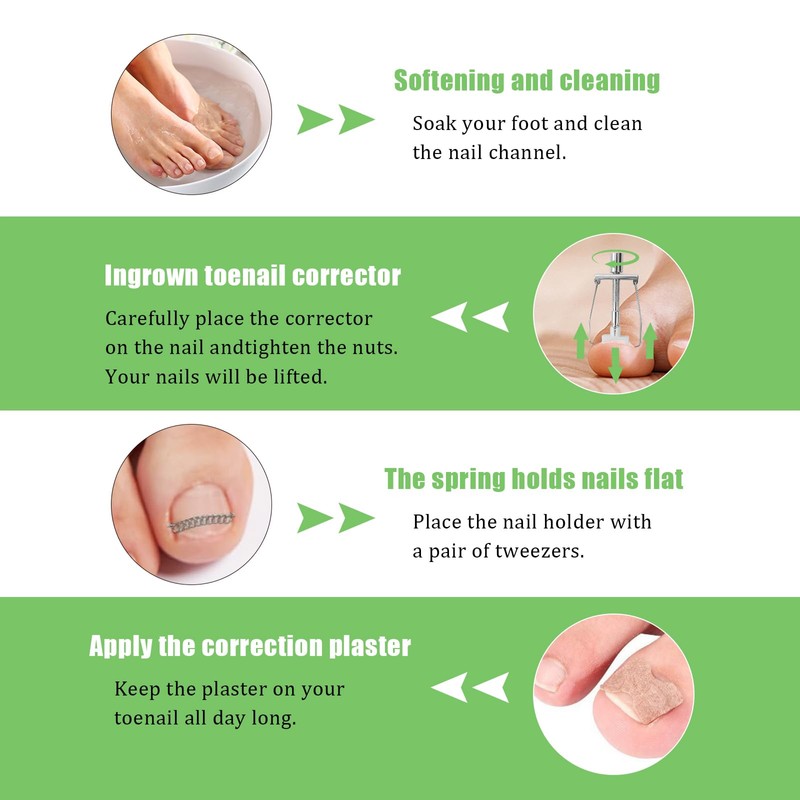 Eingewachsene zehennägel set ist besonders praktisch in der Anwendung. Entfernen Sie mit einer Nagelfeile Schmutz im Inneren der Nägel. Wählen Sie einen Nageldrücker in der richtigen Größe. Legen Sie das Pflaster zur Korrektur eingewachsener Nägel auf und drehen Sie den Knopf. Weichen Sie die Zehennägel etwa 20 Minuten in warmem Wasser ein. Drehen Sie den Knopf weiter und föhnen Sie die Nägel mit einem Föhn. Fixieren Sie die Nägel mit einer Pinzette. Kleben Sie das Pflaster zur Korrektur eingewachsener Nägel auf beide Seiten der Zehennägel und wechseln Sie es regelmäßig.