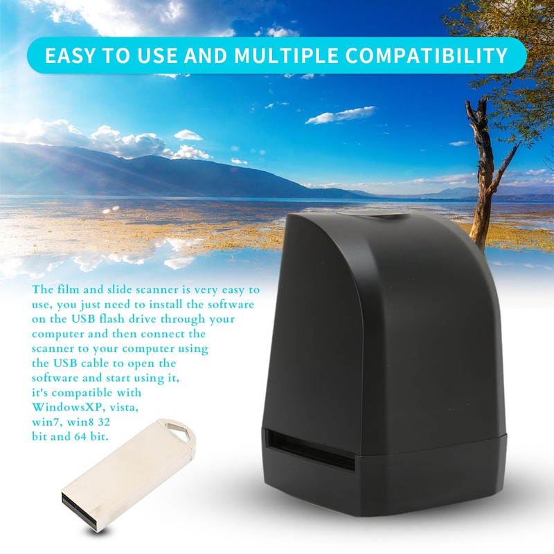- EASY TO USE AND MULTIPLE COMPATIBILITY:The film and slide scanner is very easy to use, you just need to install the software on the USB flash drive through your computer and then connect the scanner to your computer using the USB cable to open the software and start using it, it's compatible with WindowsXP, , win7, win8 32 bit and 64 bit.