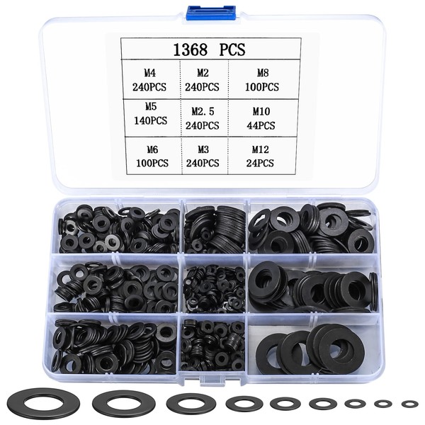 • Package includes: 1368 pieces in total, sizes and quantities include: 240 pieces m2, 240 pieces m2.5, 240 pieces m3, 240 pieces m4, 140 pieces m5, 100 pieces m6, 100 pieces m8, 44 pieces m10, 24 pieces M12. 9 sizes available, 9 Different washers can meet your different usage requirements.