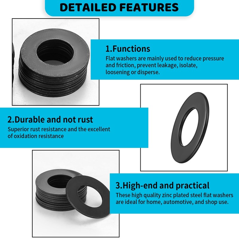 • Excellent performance: washers provide a flat supporting surface for parts, increases the contact surface and distributes pressure on the supporting surface of screws and other fasteners, reducing friction, preventing leaks and loosening.