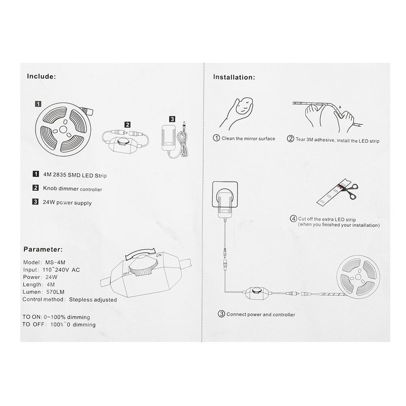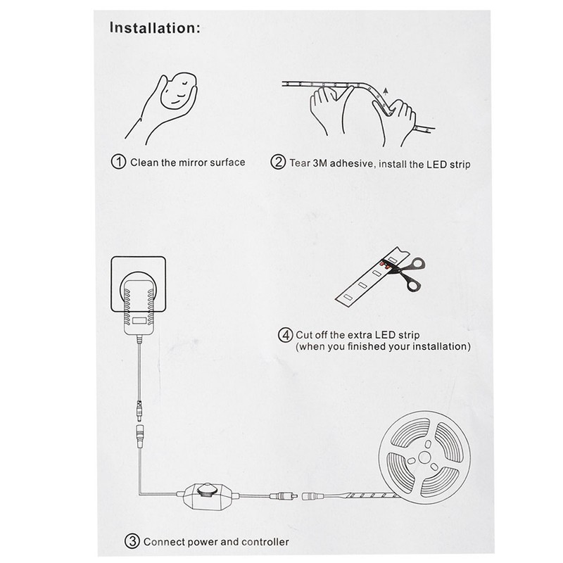Cold white color LED Strip Light can be used on the makeup mirror, wall, bathroom mirror, bedroom etc. With a dimmer switch to control the light, make it bright or less bright according to your actual need, also it can turn on or off the light.