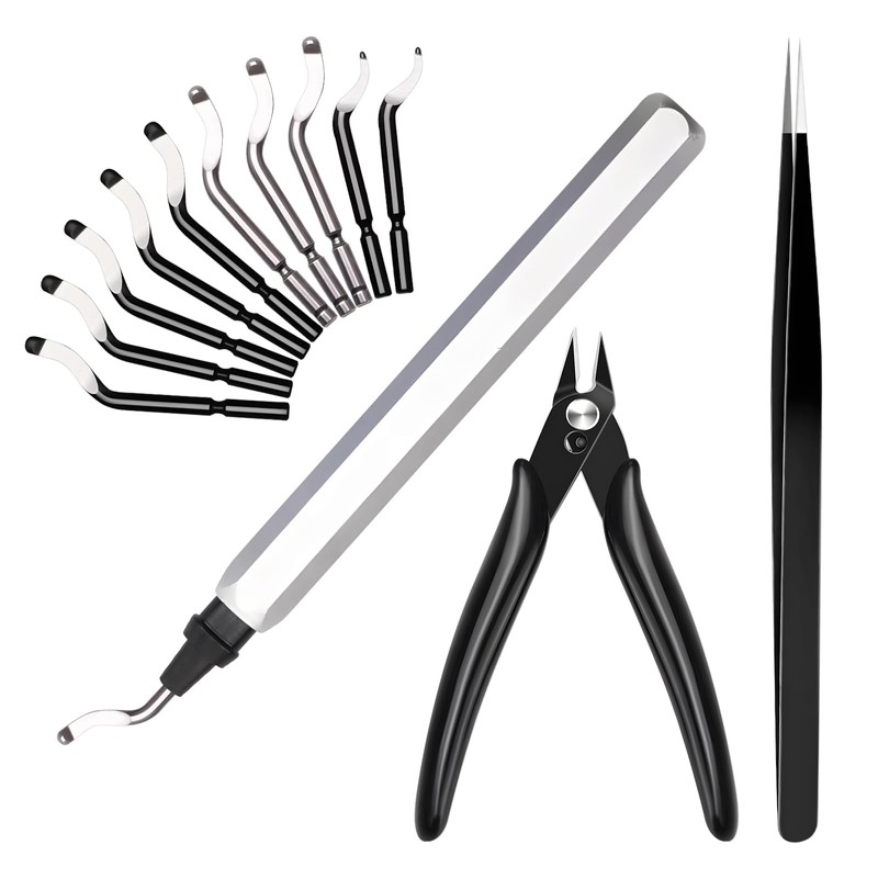 - 【Complete 3D Print & Metal Deburring Kit】Handle, flush cutter, 10 specialized blades, and tweezers for comprehensive burr removal. Effortlessly clean 3D printed parts, metal (steel, aluminum, brass), resin, plastic, and copper surfaces