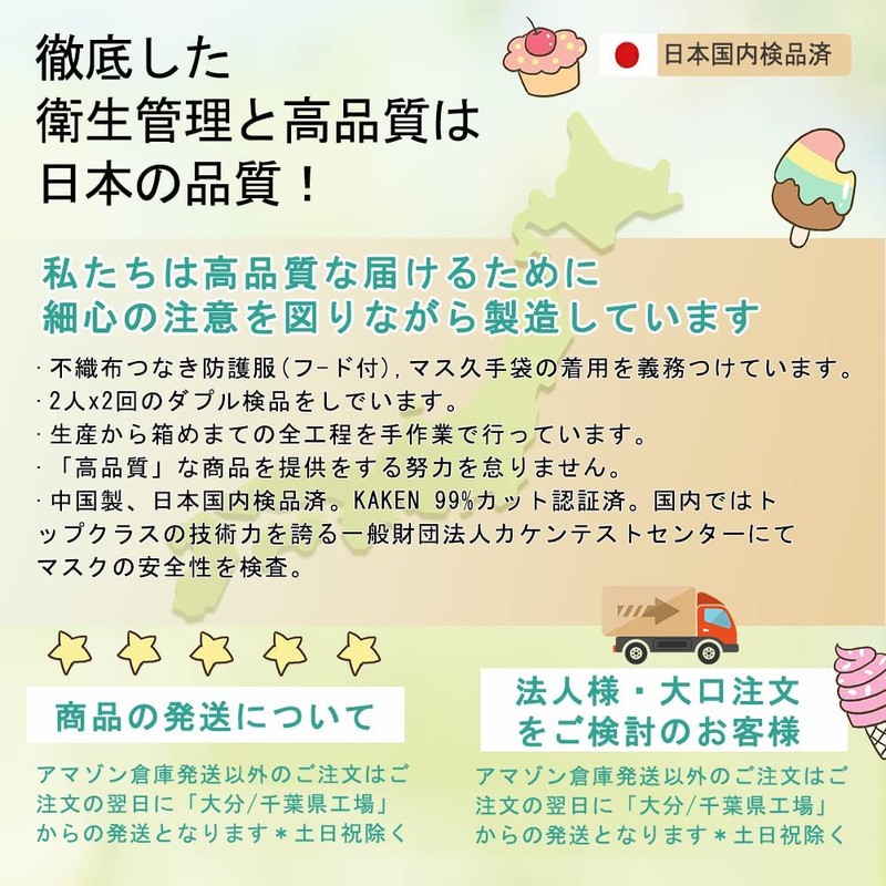 - 【日本国内検品済】3層構造の高密度フィルターを採用!日本の検査機関でフィルター性能の検査を行い、(微粒子)PFE99.6%、(バクテリア飛沫)BFE99.6%、(ウィルス)VFE99.5%以上、安心・安全の高品質不織布マスクとして認証されています。