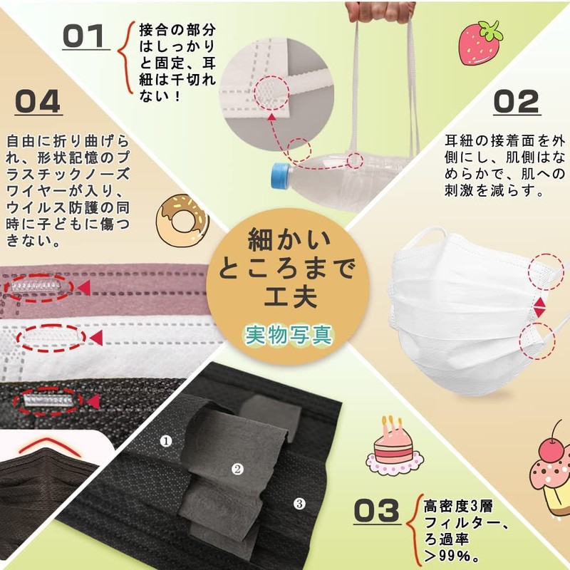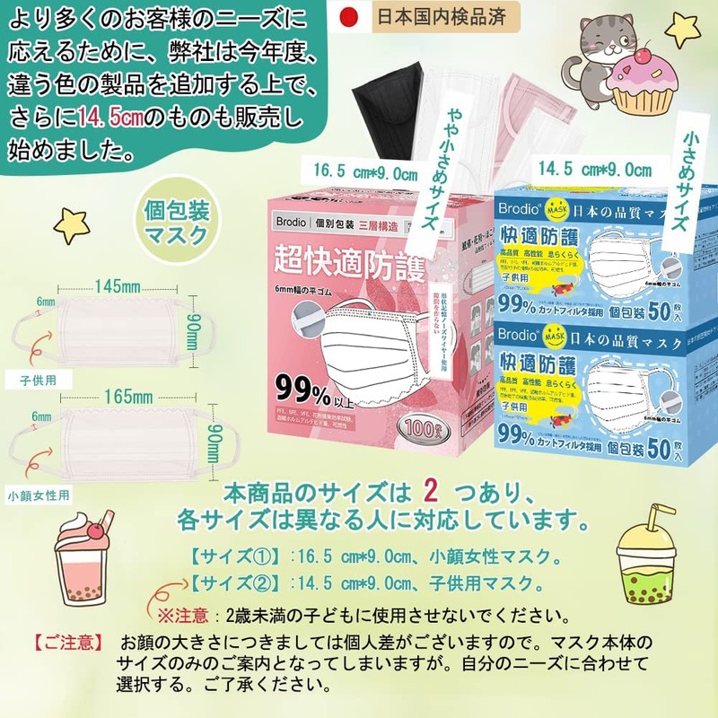 - 【基本情報】色:ホワイト/ブラック/アプリコットピンク。個包装マスク。本商品のサイズは 3 つあり、各サイズは異なる人に対応しています。【サイズ①】:16.5 cm*9.0cm、小顔女性マスク。【サイズ②】:14.5 cm*9.0cm、子供用マスク。※注意:2歳未満の子どもに使用させないでください。【サイズ③】:17.5 cm*9.5cm、普通サイズ(大人用)、男女兼用。【ご注意】お顔の大きさにつきましては個人差がございますので。マスク本体のサイズのみのご案内となってしまいますが。自分のニーズに合わせて選択する。ご了承ください。このマスクは使い捨てマスクです。洗濯後の再使用はしないでください。弊社の商品を長くご愛用頂きくように、ご購入日より一年間のアフターサービスをご提供致します。商品に不具合またはご不明な点があれば、是非Amazonの購入履歴より、弊社にご連絡ください。