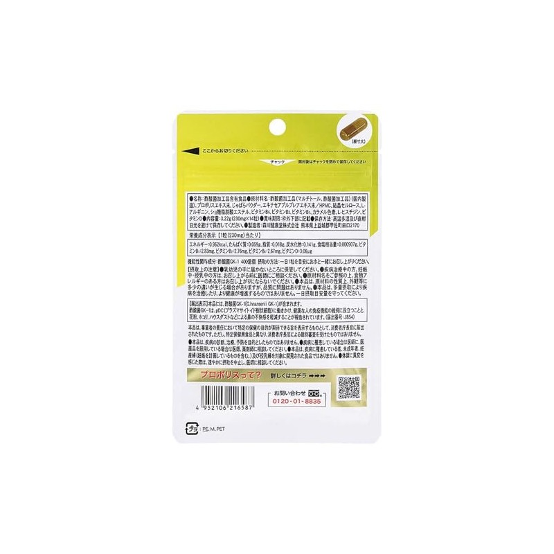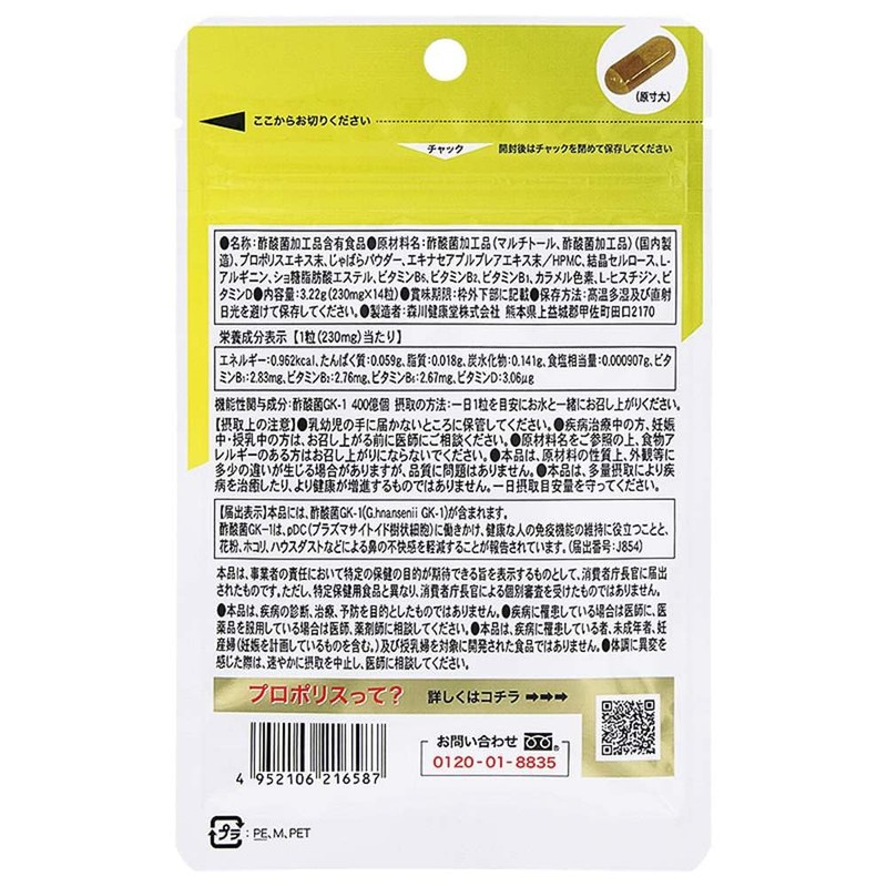 - 【原材料名】酢酸菌加工品(マルチトール、酢酸菌加工品)(国内製造)、プロポリスエキス末、じゃばらパウダー、エ キナセアプルプレアエキス末/HPMC、結晶セルロース、L-アルギニン、ショ糖脂肪酸エステル、ビタミ ン B6、ビタミンB2、ビタミンB1、カラメル色素、L-ヒスチジン、ビタミンD