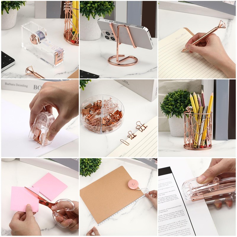 - Sufficient to Meet Your Needs: you will get 14 pieces of gold desk accessory kits, including staple remover, pen holder, note box, metal mesh organizer, phone holder, stapler, staple remover, staples, scissors, binder clips, tape measure, 2 pens, ruler; Sufficient quantity will meet your using needs, and you can share them with your family